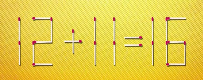 A figura mostra uma igdade matemática incorrecta 12 + 11 = 16. É constituída por 23 fósforos. Um deles está colocado no sítio errado. Se o moveres para outro local, a igdade ficará correta. A ttarefa é adivinhar q é o fósforo e para onde o deves mover.