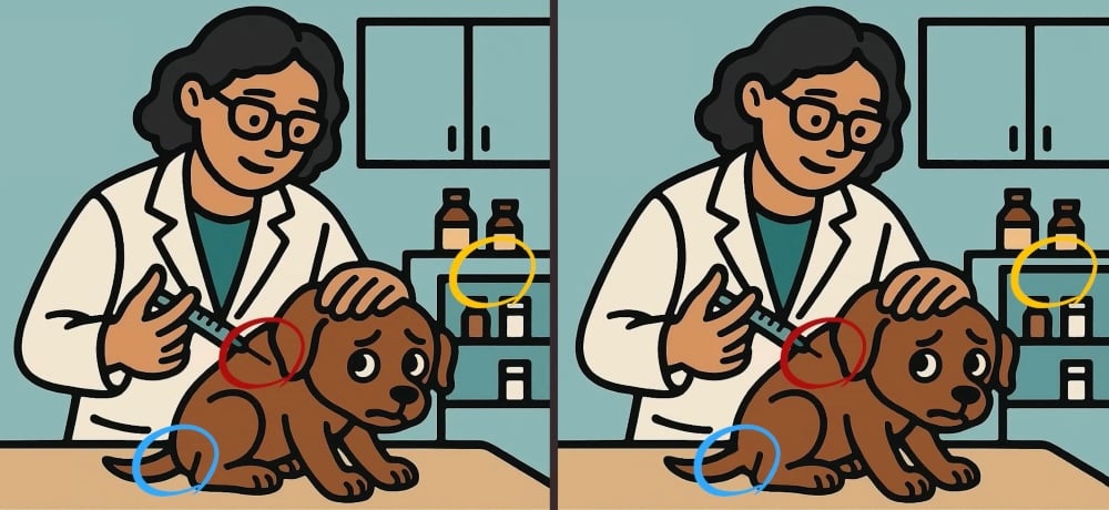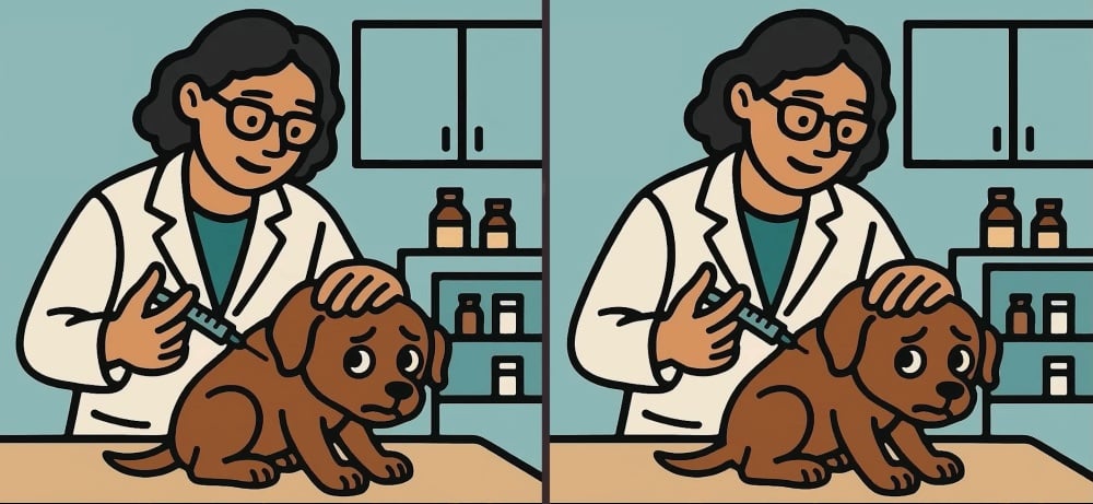 Então, estás pronto para o próximo desafio? Observe com atenção d imagens de um veterinário a dar uma injeção a um cão. À primeira vista, as imagens podem parecer igs, mas existem 3 pequenas diferenças. Achas que consegues encontrá-las todas em 63 segundos? Experimente e teste a sacuidade vis!