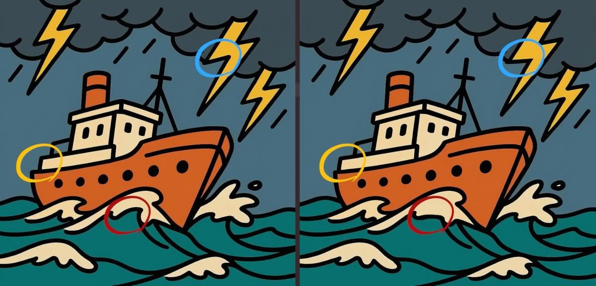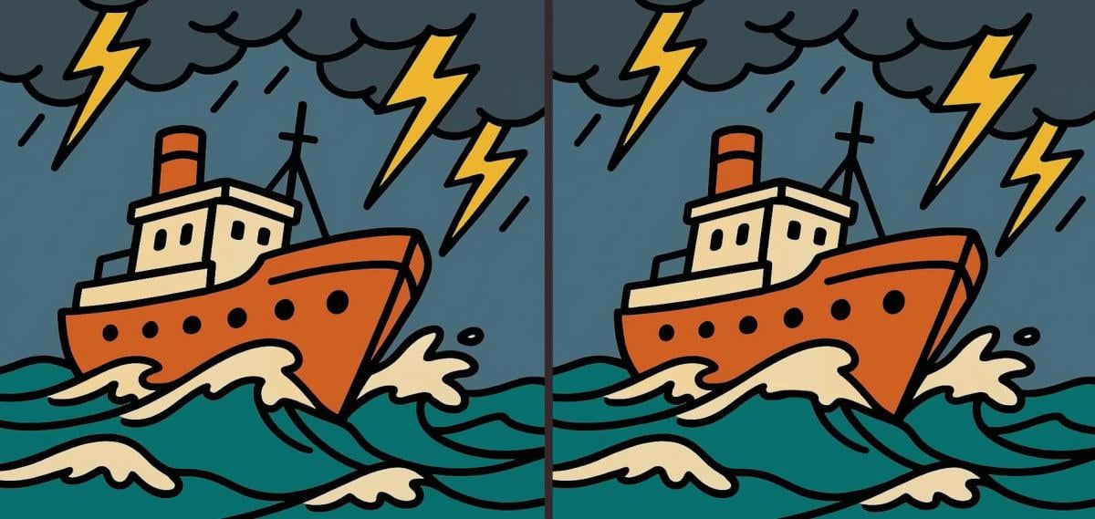 Então, estás pronto para o próximo desafio? Observe com atenção d imagens de um navio a navegar durante uma tempestade. As imagens podem parecer exatamente igs, mas não se deixe enganar. Há três diferenças ocultas. O truque é que só tem 65 segundos para as encontrar a todas. Experimenta e testa a tacuidade vis!