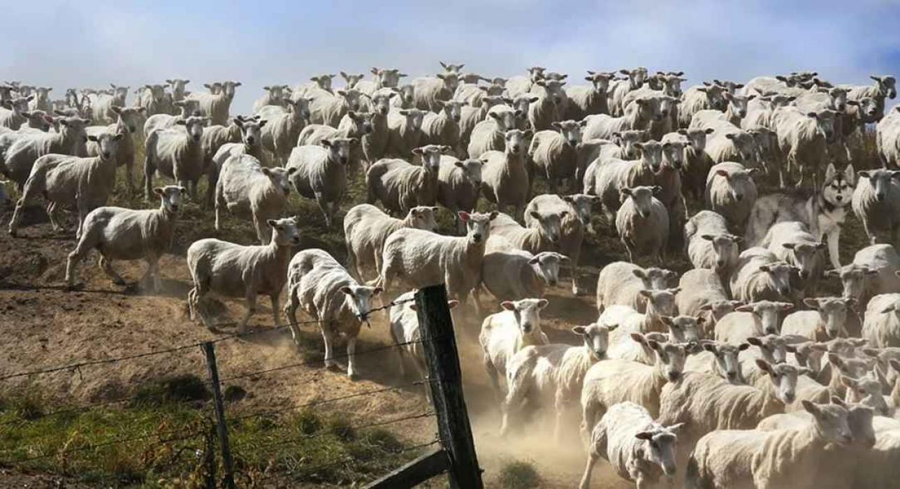 A imagem mostra um pasto com muitas ovelhas. Temos de encontrar um cão entre elas, que está bem escondido.