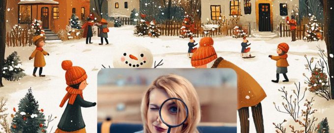 Em baixo, vê-se uma imagem de uma praça coberta de neve onde as pessoas estão a caminhar. Alguém está a jogar bolas de neve, alguém está a fazer um boneco de neve ou simplesmente a admirar a paisagem de inverno.