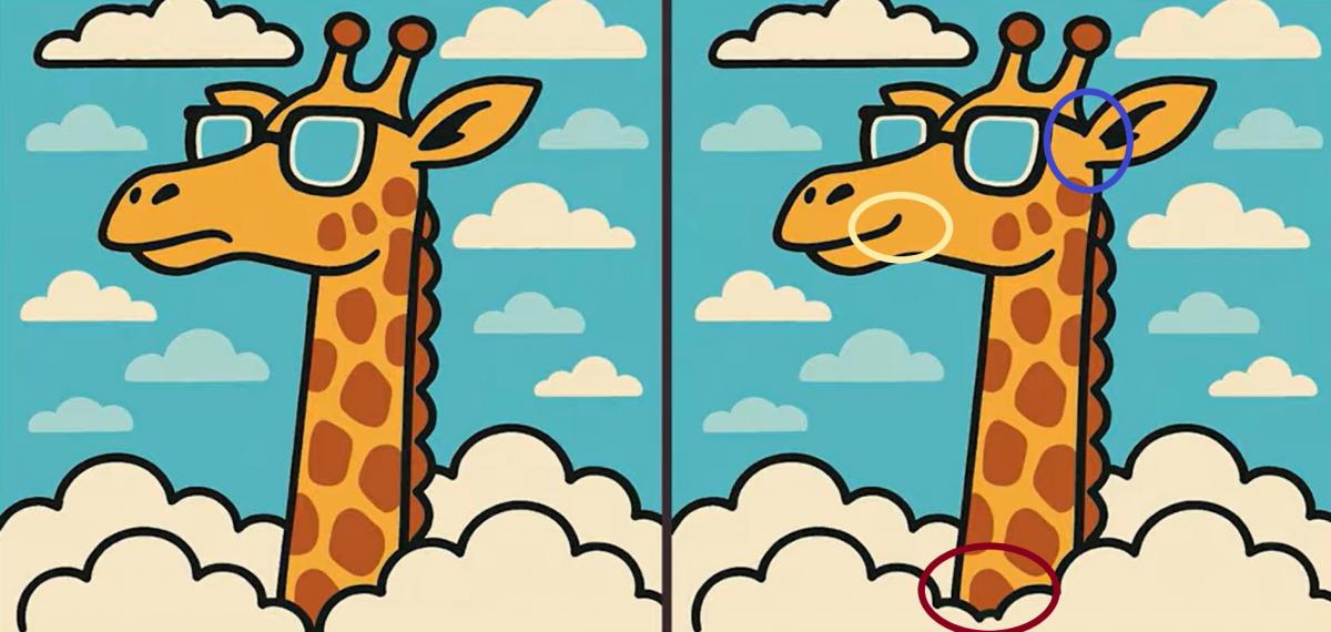 Então, estás pronto para o próximo desafio? Observe com atenção as d imagens da girafa com óculos. Podem parecer igs à primeira vista, mas há 3 pequenas diferenças. Achas que consegues encontrá-las todas em 23 segundos? Experimenta e testa a tacuidade vis!